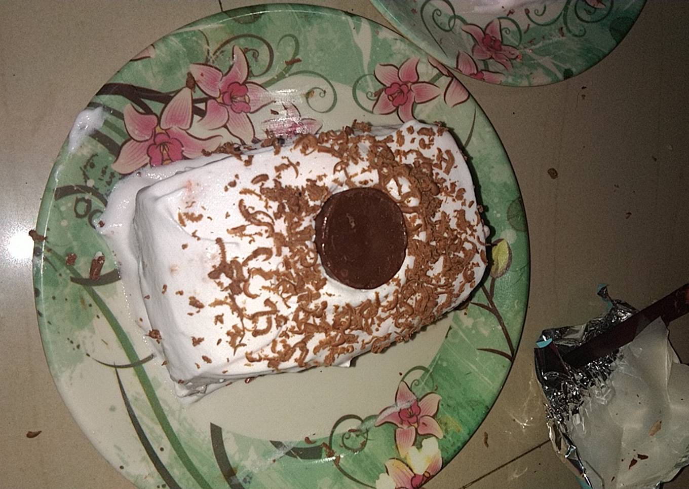 - First take a chocolate cake Put some whipped cream label it with butter knife and garnish with some grated chocolate and Chocolate at top put it in fridge for 15 minutes and enjoy....