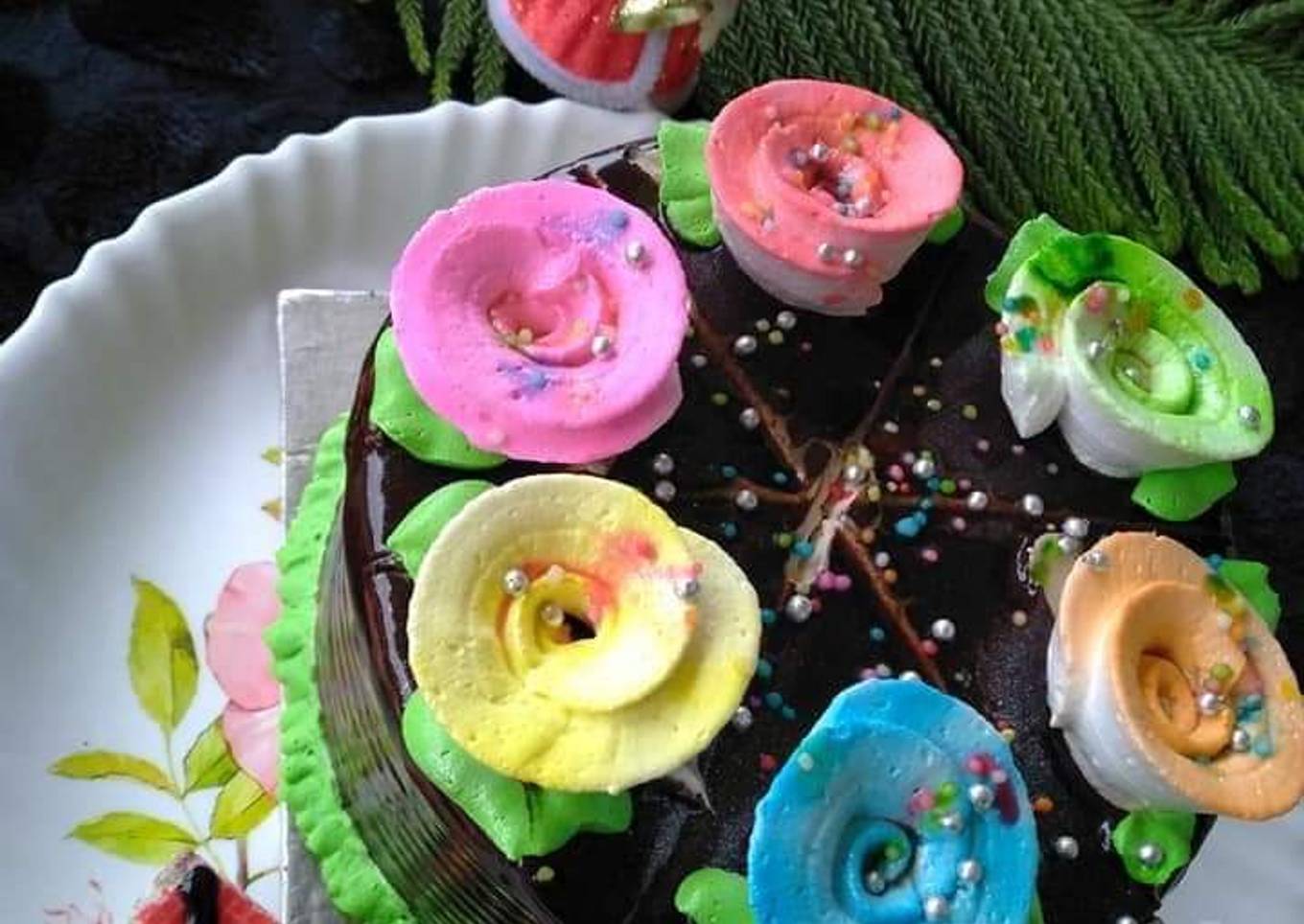 - When the chocolate is set properly put incisions (cuts) using sharp cake knife on top in equal distance for making roses using the spare white whipped cream, sprinkle food powder colour on roses, put a drop of apple green in some white whipped cream, make leaves of that.