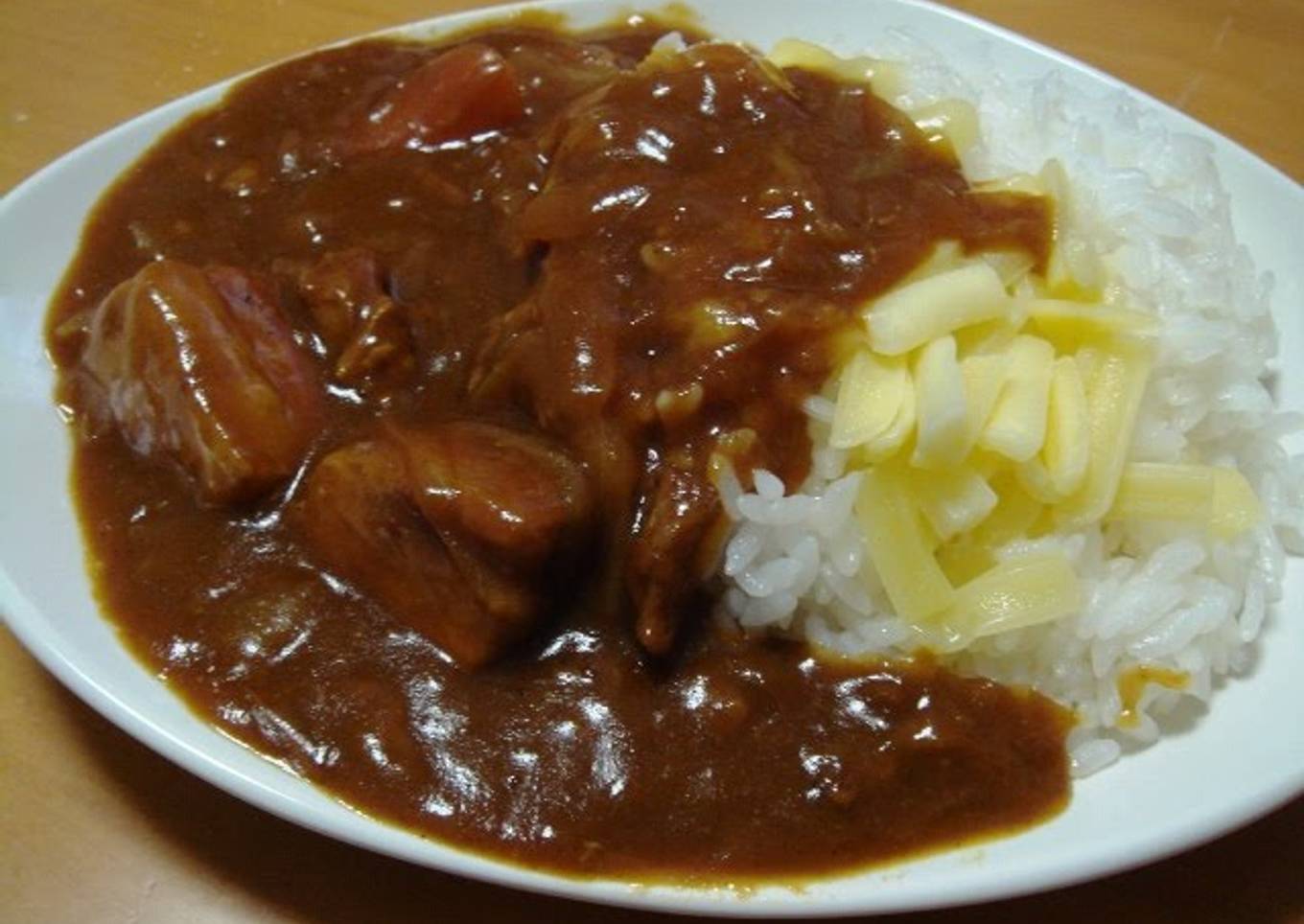 - Reheat the cooled curry. Top the rice with melting type cheese, then ladle the slowly simmered curry. Done!!