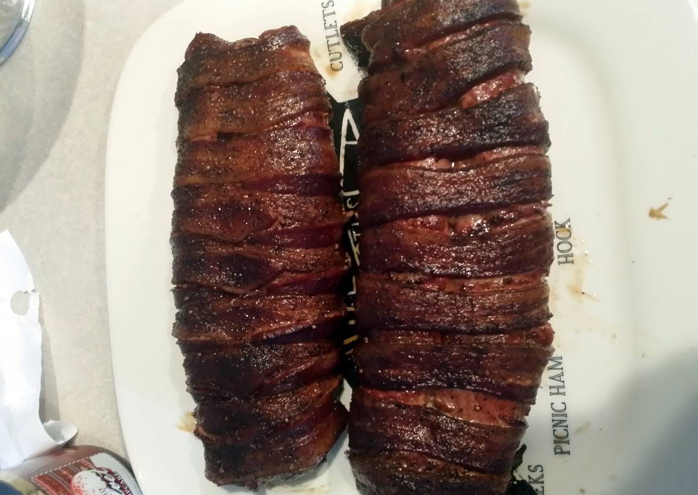 - Wrapped in bacon halfway around 1 tenderloin tucking in between the two tenderloin and overlap with the next piece
