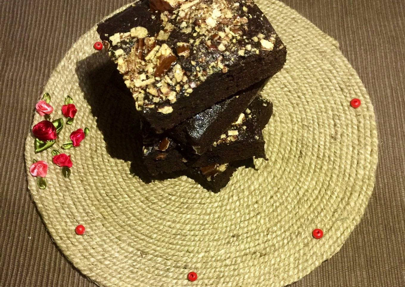 add them to the wet mixture and fold. don't use beater now. - Pour the mixture into the pan and sprinkle some nuts,chop chocolate and bake at 150°C for 20-25 minutes same goes with stove baking check after 20 minutes to get the wet moist flaky texture. (My Brownies ready in 25 mins)Donot over bake, let them remain soft and wet.